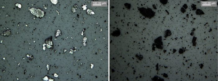 What appears to be metallic debris under incident light can be seen as dark particulates under side on illumination (dark field).