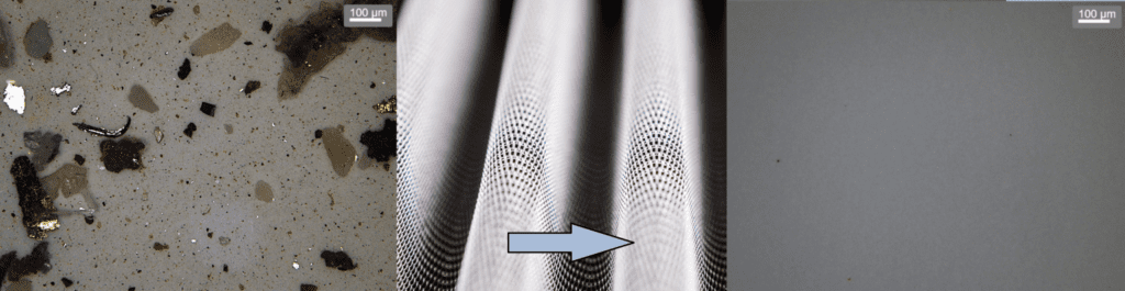 The overview/tile stitching facility lets us construct overviews of an entire membrane or ferrography slide. In the following overview we were able to use Dark Field illumination to successfully separate translucent particles from the woven 11µm membrane patch, which is also translucent.